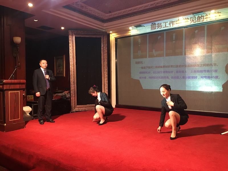 商務(wù)禮儀,通常指的是禮儀在商務(wù)行業(yè)之內(nèi)的具體運(yùn)用,主要泛指商務(wù)人員在自己的工作崗位上所應(yīng)當(dāng)嚴(yán)格遵守的行為規(guī)范。學(xué)習(xí)商務(wù)禮儀除了有利于規(guī)范行為外,還有利于傳遞信息、增進(jìn)感情,以及樹立形象,是個人和企業(yè)發(fā)展不可或缺的重要素質(zhì)。此次培訓(xùn),馮總從儀表著裝、交往舉止、溝通禮儀、電話禮儀、會議禮儀等方面入手,不僅詳細(xì)講解了職場服裝、發(fā)飾、領(lǐng)帶、著裝搭配以及基本的商務(wù)禮儀規(guī)范,同時還與酒店的兩位工作人員共同現(xiàn)場演示了商務(wù)活動中的站、坐、走、拾物等基本規(guī)范要領(lǐng),以及服務(wù)人員接待客人時的問好、致歉、指引等動作標(biāo)準(zhǔn),使大家能夠更直觀、準(zhǔn)確的掌握基本商務(wù)禮儀。此外,馮總還結(jié)合自身多年酒店工作經(jīng)驗和外出學(xué)習(xí)經(jīng)驗,以視頻、案例、情景模擬等方式,將實際工作中會出現(xiàn)的問題及行為標(biāo)準(zhǔn)進(jìn)行了生動展示,有效提高了窗口單位人員的綜合素質(zhì)。
