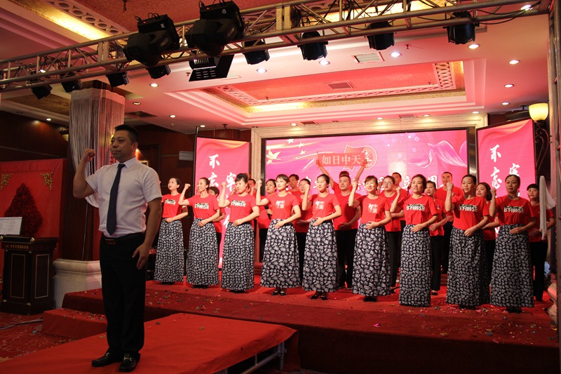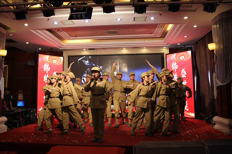 集團總部機關(guān)代表隊當(dāng)《沒有共產(chǎn)黨就沒有新中國》的旋律響起,當(dāng)巨型的國旗升起,贏得了熱情的掌聲。一首《眾人劃槳開大船》,唱出了特有的氣勢。特別是于寶權(quán)董事長和于洪波總經(jīng)理登臺演唱,把演唱推向了高潮。萬豪酒店代表隊表演的《紅色娘子軍》,在馮國總經(jīng)理的指揮下,非常有氣勢,具有很高的感染力。