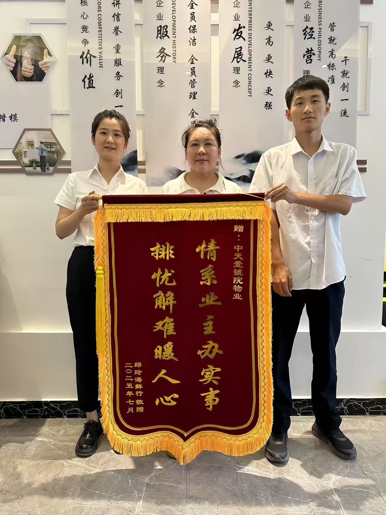 2025年7月12日,壹號院小區(qū)門市業(yè)主邱女士帶著一面寫有“情系業(yè)主辦實事 排憂解難暖人心”的錦旗,送到了小區(qū)物業(yè)服務(wù)中心,向物業(yè)工作人員及管家表達感謝。接下來,就讓我們一起走進錦旗背后的故事吧!