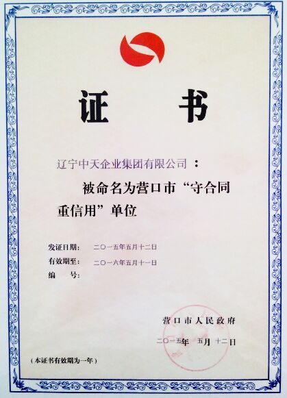 在激烈的市場競爭中,“誠信”是企業(yè)最大的品牌。中天集團自成立以來,始終注重加強企業(yè)的誠信建設,堅持誠信為本、信用至上的發(fā)展原則,用誠信打動客戶、用誠信贏得市場,打造“誠信中天”的企業(yè)品牌。2015年,集團再次被評為市“守合同重信用”單位,這是中天集團多年來一直堅持守合同重信用工作,以誠信推動企業(yè)發(fā)展的結果;是對中天集團全體員工日常點點滴滴辛勤工作的溫情回報;更是社會各界對中天集團持續(xù)、穩(wěn)健發(fā)展的充分認可與贊揚。