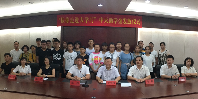 2017年8月11日上午,營口市希望工程扶你走進大學門之“中天助學金”發(fā)放儀式在中天集團總部會議室舉行。中天集團董事長于寶權(quán)、共青團營口市委書記遲程、營口市希望工程辦公室主任趙潔等領(lǐng)導出席了本次發(fā)放儀式。來自省實驗營口分校、營口市第三高級中學、大石橋市高級中學、大石橋市第二高級中學以及蓋州市第一高級中學的16名貧困學生每人從于寶權(quán)董事長手中領(lǐng)到5000元捐助資金,解決了他們的入學費用,圓了他們的大學夢。